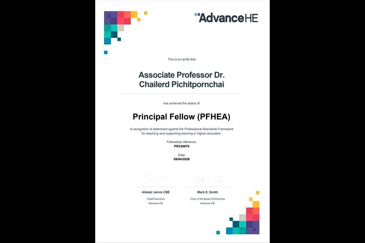 This prestigious recognition marks him as the 8th recipient in Thailand to achieve this highest level of professional recognition in teaching and learning support in higher education. The award reflects his outstanding leadership, extensive experience, and significant contributions to advancing teaching excellence at an international standard.