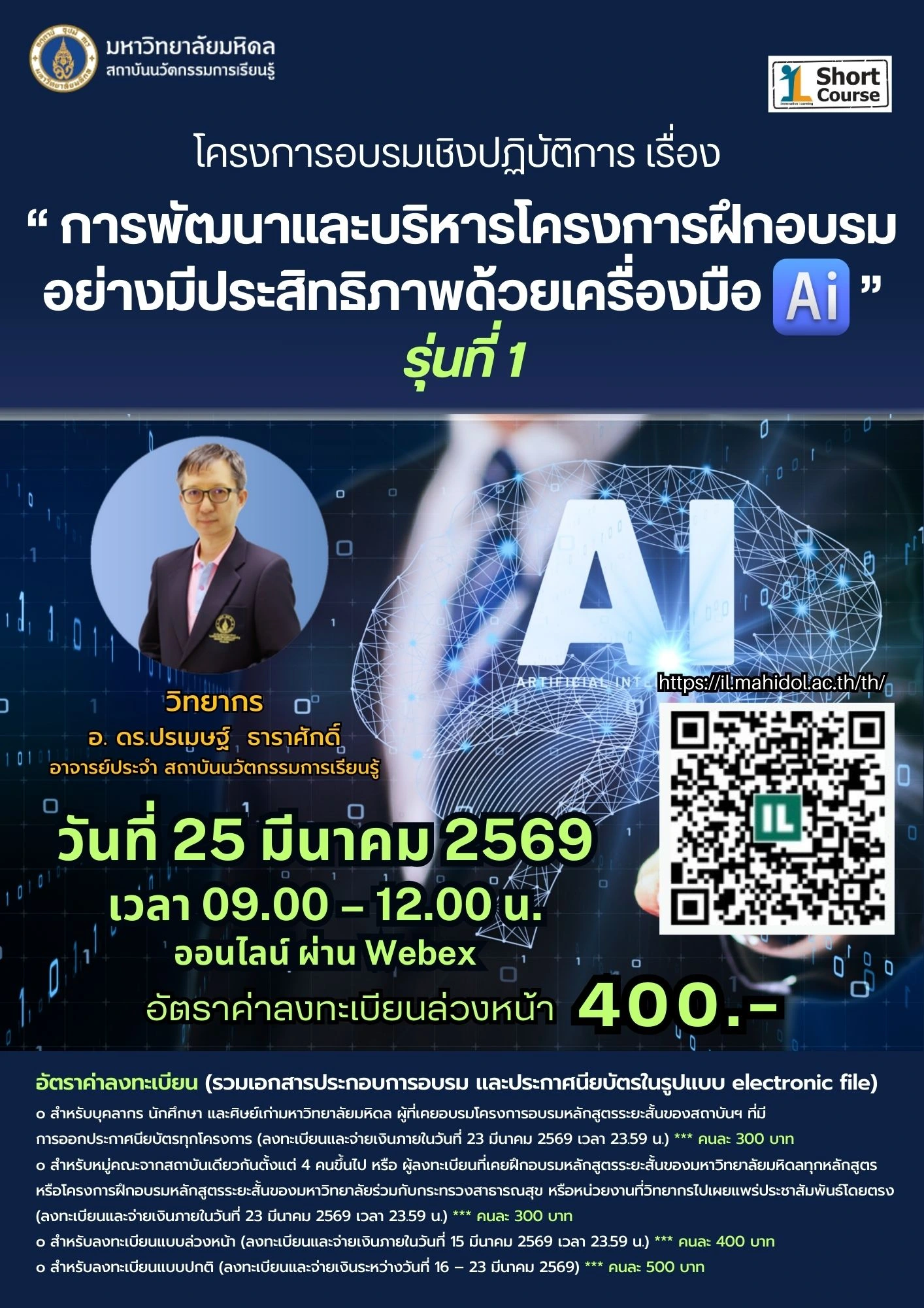 1. สำหรับบุคลากร นักศึกษา และศิษย์เก่ามหาวิทยาลัยมหิดล ผู้ที่เคยอบรมโครงการอบรมหลักสูตรระยะสั้นของสถาบันฯ ที่มีการออกประกาศนียบัตรทุกโครงการ (ลงทะเบียนและจ่ายเงินภายในวันที่ 23 มีนาคม 2569 เวลา 23.59 น.) *** คนละ 300 บาท