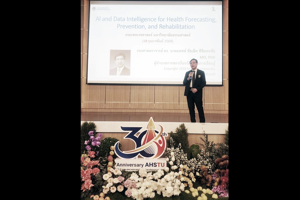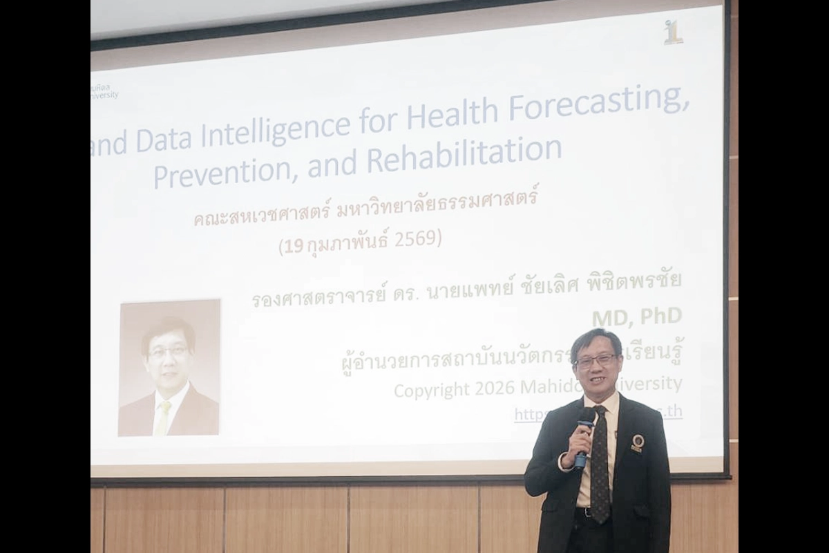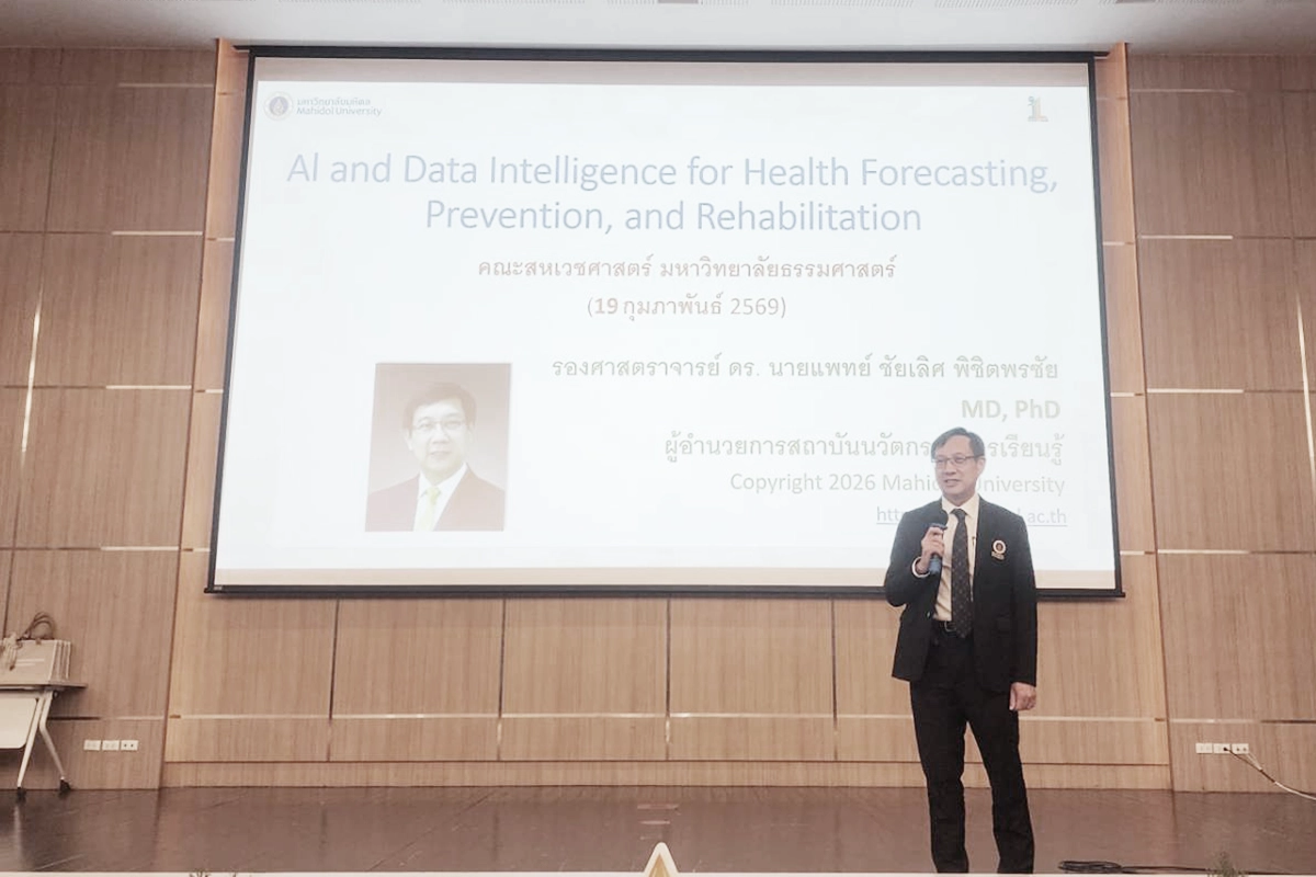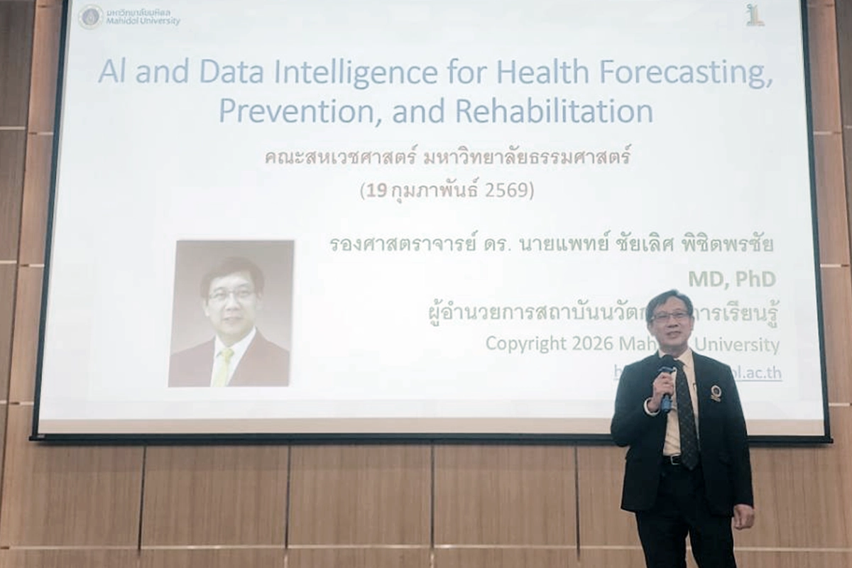 ในโอกาสนี้ คณะสหเวชศาสตร์ มหาวิทยาลัยธรรมศาสตร์ ได้เรียนเชิญ รองศาสตราจารย์ ดร.นายแพทย์ชัยเลิศ พิชิตพรชัย ผู้อำนวยการสถาบันนวัตกรรมการเรียนรู้ มหาวิทยาลัยมหิดล ให้เกียรติเป็นวิทยากรบรรยายในหัวข้อ “การใช้ AI และ Data Intelligence เพื่อการพยากรณ์ ป้องกัน และฟื้นฟูสุขภาพ” ซึ่งมุ่งเน้นการประยุกต์ใช้ปัญญาประดิษฐ์และข้อมูลอัจฉริยะในการพัฒนาระบบสุขภาพเชิงรุก วันที่ 19 กุมภาพันธ์ 2569 ณ ห้องประชุม Auditorium ชั้น 2 อาคารเรียนและปฏิบัติการรวม มหาวิทยาลัยธรรมศาสตร์ ศูนย์รังสิต