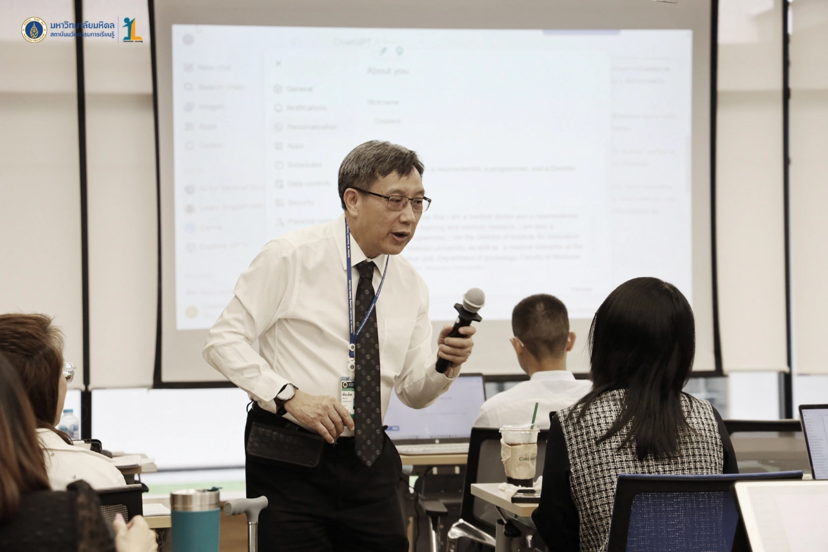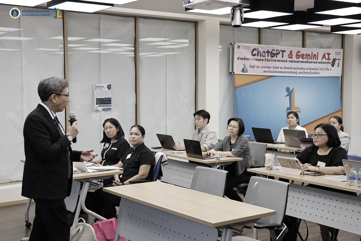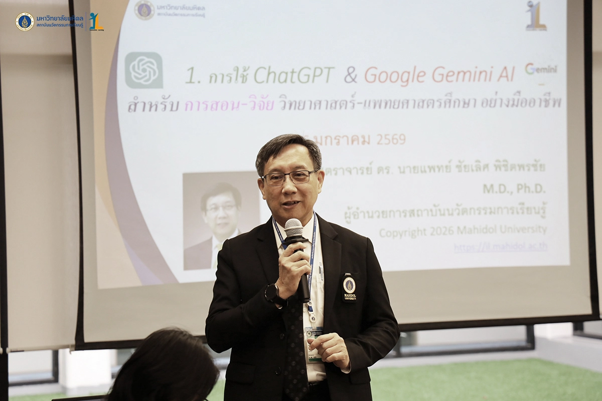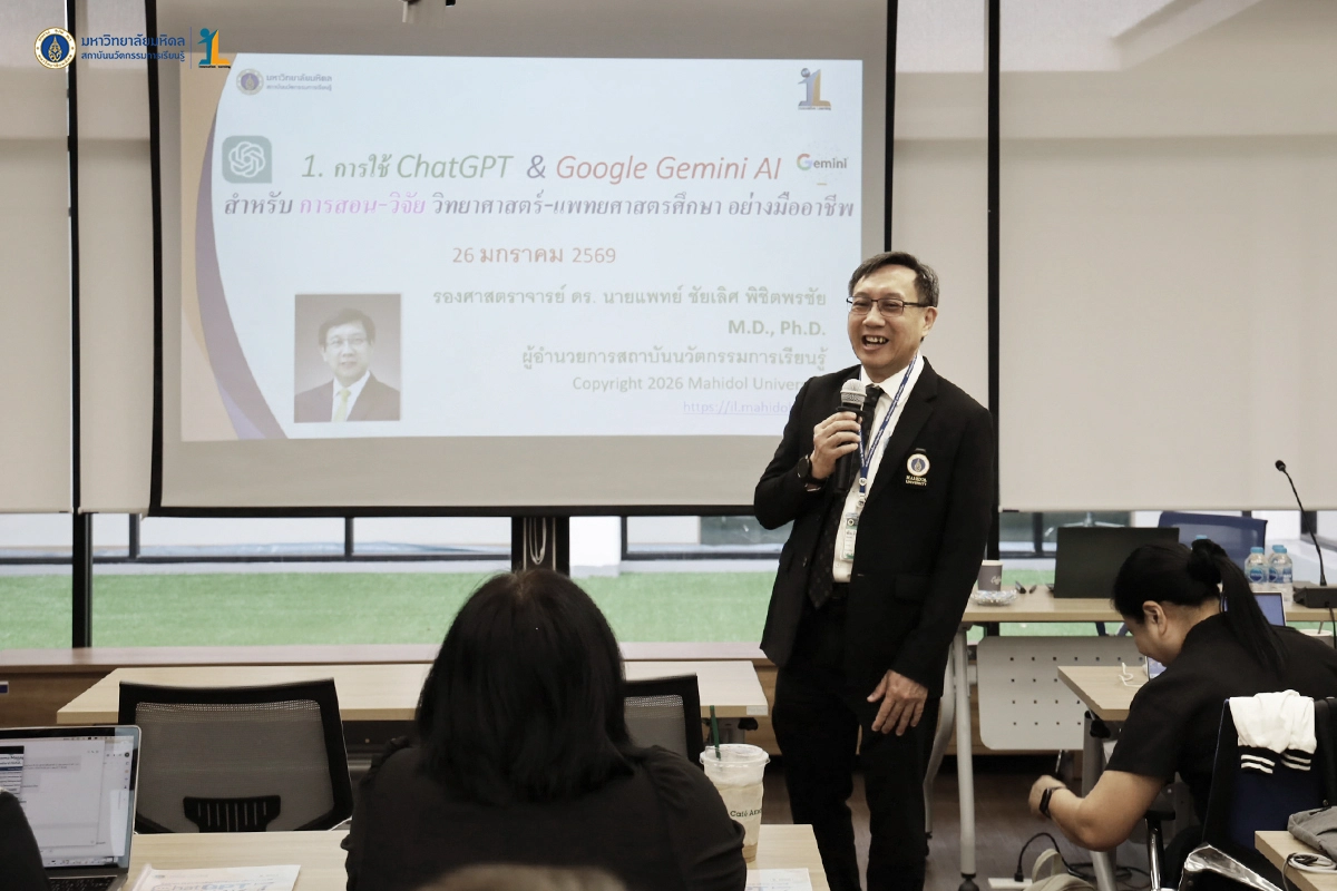 สถาบันนวัตกรรมการเรียนรู้ มหาวิทยาลัยมหิดล จัดโครงการอบรมเชิงปฏิบัติการ เรื่องการใช้ ChatGPT & Gemini สำหรับการสอนและวิจัยวิทยาศาสตร์-แพทยศาสตรศึกษาอย่างมืออาชีพ รุ่นที่ 7 โดย รองศาสตราจารย์ ดร.นายแพทย์ชัยเลิศ พิชิตพรชัย ผู้อำนวยการสถาบันฯ เป็นวิทยากร วัตถุประสงค์ของการอบรม เพิ่มพูนความรู้และความเข้าใจในหลักการพื้นฐานของการใช้ ChatGPT และ Gemini ก้าวข้ามข้อจำกัดและข้อควรระวังในการใช้ ChatGPT ประยุกต์ใช้ในการจัดการเรียนการสอนและการวิจัยอย่างมีประสิทธิภาพ เสริมสร้างเทคนิคการสอนวิทยาศาสตร์และการสอนแพทยศาสตรศึกษาอย่างมืออาชีพ เพิ่มศักยภาพในการวิจัยและการบริการวิชาการให้มีประสิทธิภาพมากยิ่งขึ้น วันที่ 26 มกราคม 2569 ณ ห้องประชุมภิญโญ พานิชพันธ์ (321) ชั้น 3 สถาบันนวัตกรรมการเรียนรู้ มหาวิทยาลัยมหิดล ศาลายา