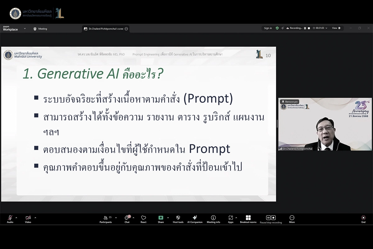 รองศาสตราจารย์ ดร.นายแพทย์ชัยเลิศ พิชิตพรชัย ผู้อำนวยการ สถาบันนวัตกรรมการเรียนรู้ มหาวิทยาลัยมหิดล เป็นวิทยากรบรรยายในหัวข้อ “Prompt Engineering เพื่อการใช้ Generative AI ในการบริหารสถานศึกษา” ให้กับผู้อำนวยการ และผู้บริหารการศึกษา จำนวน 73 คน ผ่านการอบรมแบบออนไลน์ ด้วย Zoom Application เมื่อวันที่ 27 พ. ย. 68