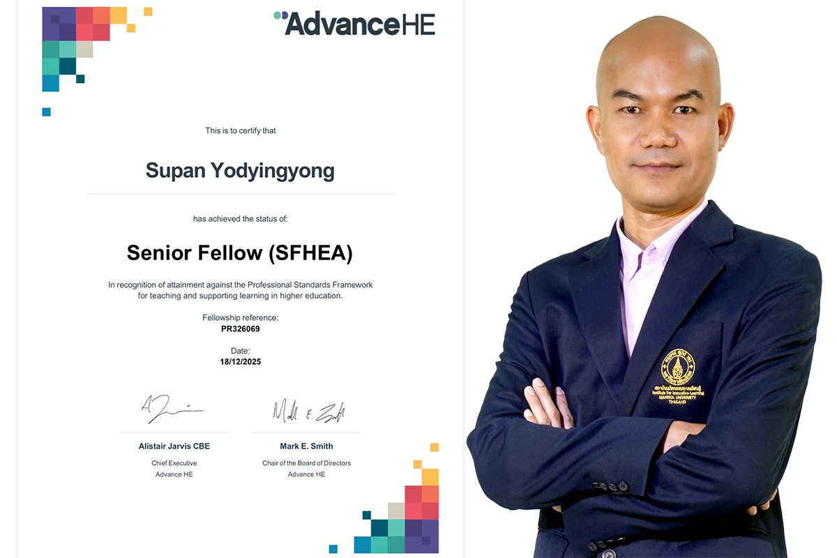 สถาบันนวัตกรรมการเรียนรู้ มหาวิทยาลัยมหิดล ขอแสดงความยินดีกับ รองศาสตราจารย์ ดร.สุชัย นพรัตน์แจ่มจำรัส และอาจารย์ ดร.สุพรรณ ยอดยิ่งยง เนื่องในโอกาสได้รับการรับรองสถานะ Senior Fellow (SFHEA) จาก Advance HE สหราชอาณาจักร วันที่ 18 ธันวาคม 2568 ซึ่งการได้รับการรับรอง Senior Fellow (SFHEA) เป็นการยอมรับในระดับนานาชาติด้านความเป็นเลิศทางวิชาชีพอุดมศึกษา สะท้อนถึงความเชี่ยวชาญ ประสบการณ์ และบทบาทความเป็นผู้นำในการจัดการเรียนการสอน การพัฒนาหลักสูตร และการส่งเสริมการเรียนรู้ในระดับอุดมศึกษาอย่างมีคุณภาพและยั่งยืน สถาบันนวัตกรรมการเรียนรู้ มหาวิทยาลัยมหิดล ขอร่วมแสดงความยินดีและภาคภูมิใจในความสำเร็จดังกล่าว ซึ่งนับเป็นแบบอย่างที่ดีด้านการพัฒนาการเรียนการสอนตามมาตรฐานสากล และเป็นการยกระดับศักยภาพทางวิชาการของมหาวิทยาลัยในเวทีนานาชาติ